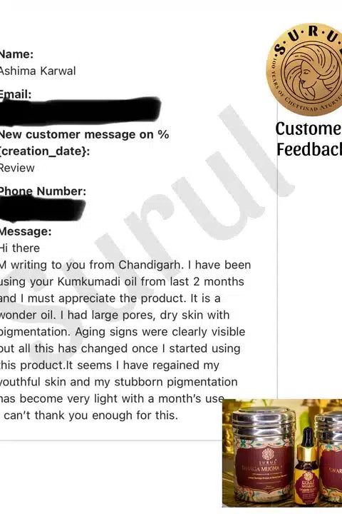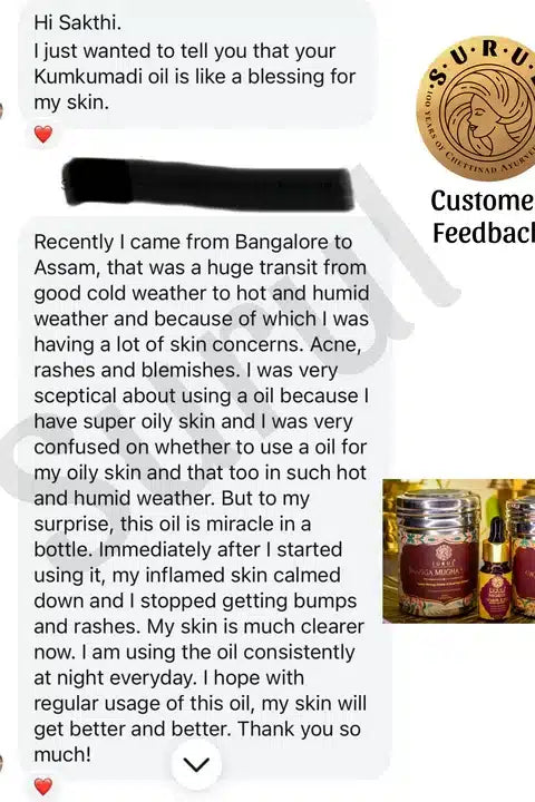 I had stubborn pigmentation for 4 years and nothing worked—until I tried Surul Kumkumadi Thailam. My pigmentation faded, pores reduced, skin feels soft, and even my dark circles are improving. Truly delivers what it promises!